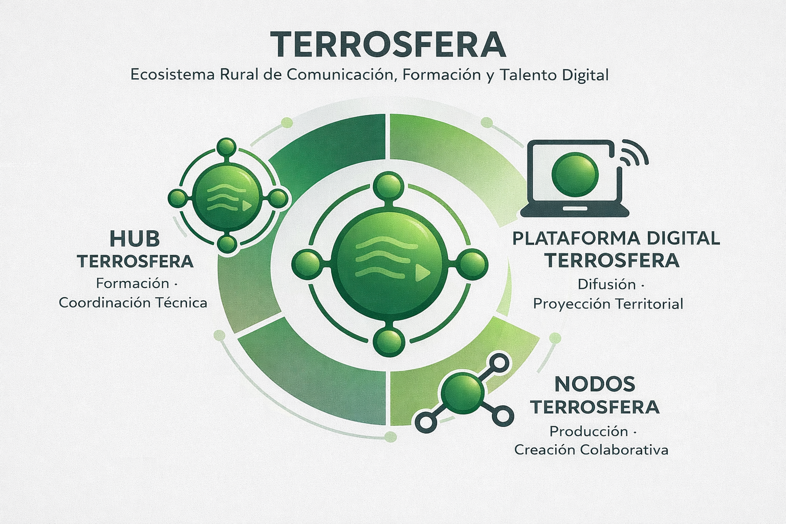 Terrosfera es un ecosistema rural orientado a mejorar la comunicación territorial, impulsar la formación digital y fomentar la creación de contenidos en municipios rurales. El proyecto se estructura de forma clara y funcional en tres ejes complementarios, cada uno con funciones bien definidas: